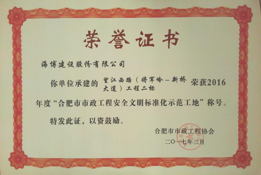 望江西路(將軍嶺路-新橋大道)建設(shè)工程二標(biāo)是空港產(chǎn)業(yè)新城與主城區(qū)重要通道,該工程積極開展安全生產(chǎn)文明施工標(biāo)準(zhǔn)化管理成效顯著,近日榮獲合肥市2016年度“市政工程安全文明標(biāo)準(zhǔn)化示范工地”。同時,該工程受到合肥市公路...