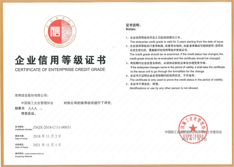 12月4日,從中國(guó)施工企業(yè)管理協(xié)會(huì)在北京召開(kāi)的“2018年工程建設(shè)誠(chéng)信企業(yè)推介大會(huì)”上傳來(lái)喜訊,在2018年度工程建設(shè)企業(yè)信用評(píng)價(jià)工作中,我司信用等級(jí)被評(píng)定“AAA”級(jí),這是繼水利部給予評(píng)定的“AAA”級(jí)之后,榮獲的第二項(xiàng)國(guó)家主管行業(yè)協(xié)會(huì)頒發(fā)的信用等級(jí)證書(shū)。