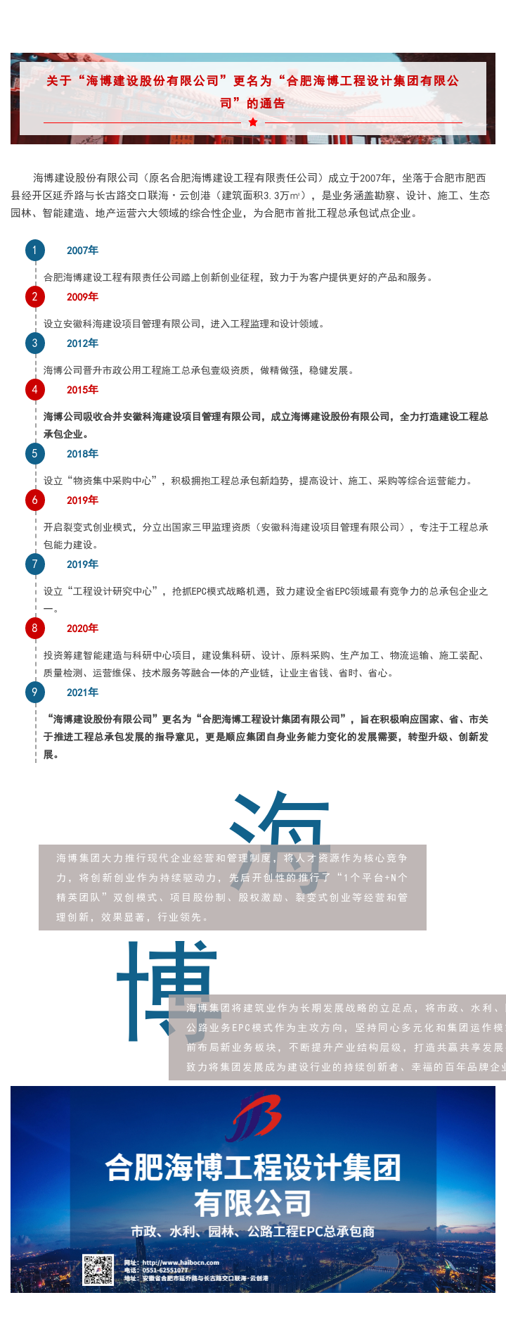 關(guān)于“海博建設(shè)股份有限公司”更名為“合肥海博工程設(shè)計集團(tuán)有限公司”的通告