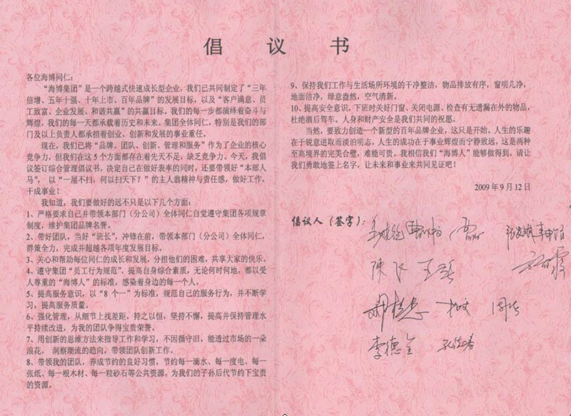 9月12日下午,公司領(lǐng)導及各部門負責人集體在公司發(fā)起的“提高綜合管理水平及自身素養(yǎng)”的倡議書上簽字,號召公司全體員工以更高標準要求自己,以“一屋不掃,何以掃天下?”的主人翁精神和責任感,做好工作,提高業(yè)務(wù)水平和自身素養(yǎng),做一個受人尊敬的“海博人”。